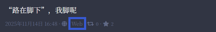 如图,在 Mastodon 里点进一条嘟文,底部会有发文时间戳、发文应用等信息。说来惭愧,作为一个中度毛象使用者,几年来我一直用 Web 刷 TL 和发文,移动端也用的 PWA,因为觉得原生 Web 够用、纯粹(虽然我所在的实例很久没更新了还停留在 3.X 版本)。前几天开始尝试用别的第三方客户端(山顶洞人终于打算走出去了),集成型的如 Flare、Fread,针对毛象的如 Tusky、Moshidon 等等,导致客户端名称一直在变。于是我想在设置里关闭显示以免暴露我善变的本质(?):