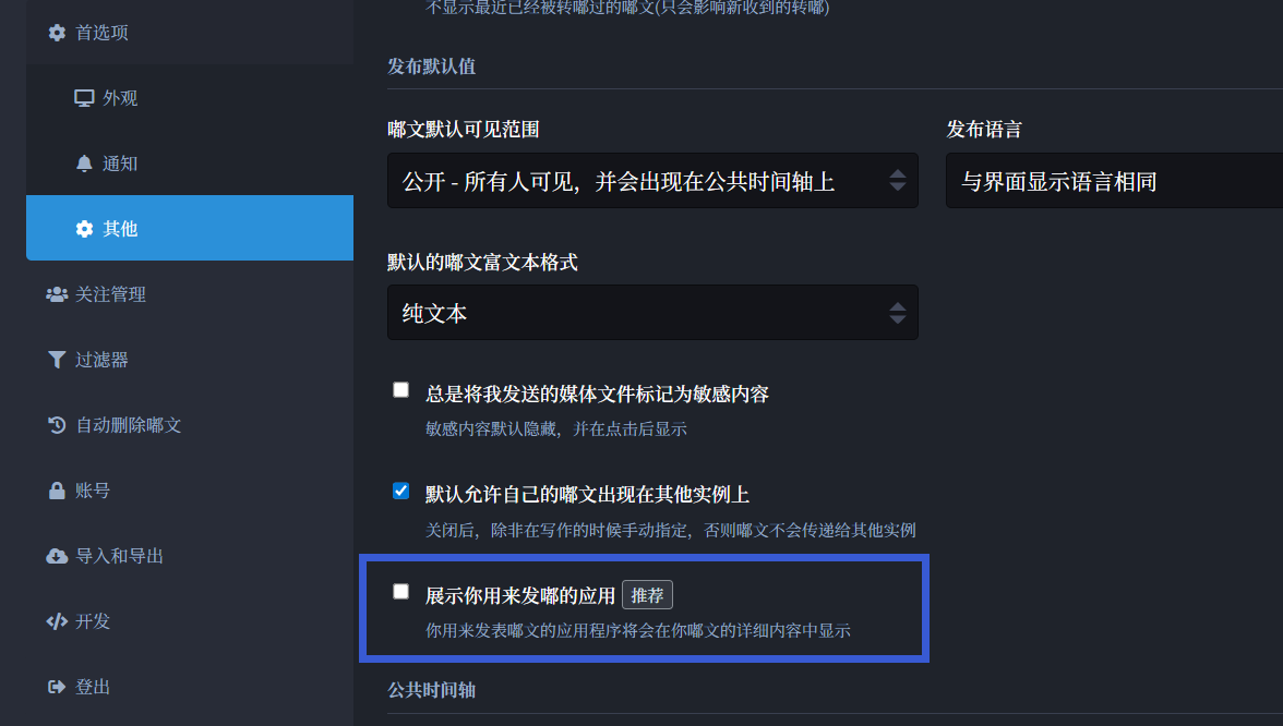 这个时候突然灵光一现,难道说、自己发的嘟文都会默认看到客户端?设置不显示之后,象友看不到但是自己看得到?就像关注列表的设置一样。得找个象友并且是同站象友问问,或者去看看源码,才能知道所谓的关闭设置是否生效。