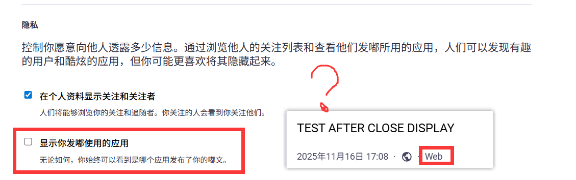 以为可以了,又发了条嘟文,结果还是没生效。猜想原因可能是:1.更新接口有问题,但在控制台看了一下传参似乎没问题,且更改的其他设置都能生效 2.本站无视设置、默认显示客户端信息,但在同站 TL 上看到有些嘟文是隐藏了客户端名称的。看来并非这些原因。